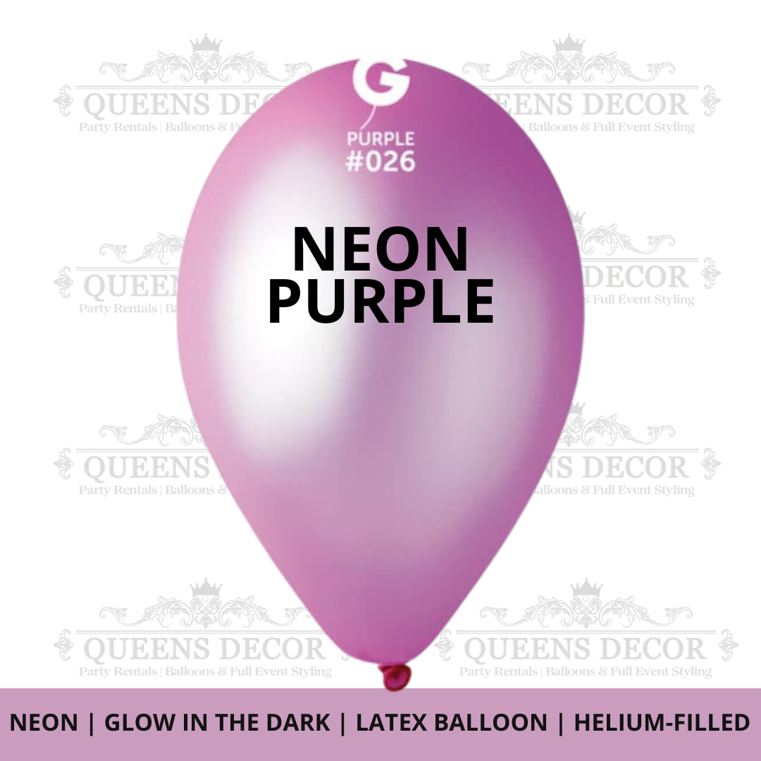 12IN. PURPLE NEON BALLOONS GLOW IN THE DARK latex balloons. Comes helium filled in various sizes. Ready for delivery or in-store pick-up