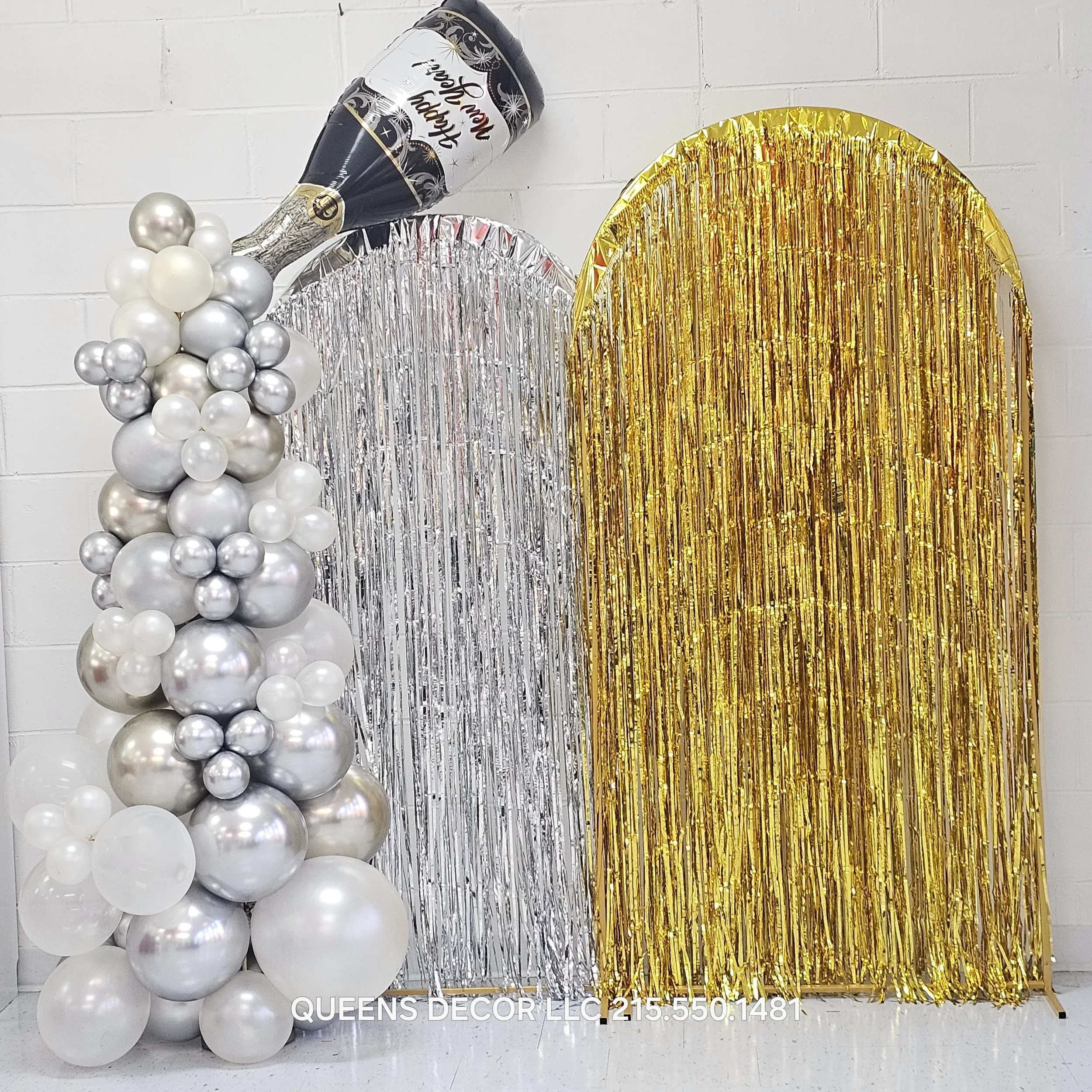 CHAIRA FRINGE WALL BACKDROP Fringe backdrop, champagne column Available for pick up at our showroom or Delivery.