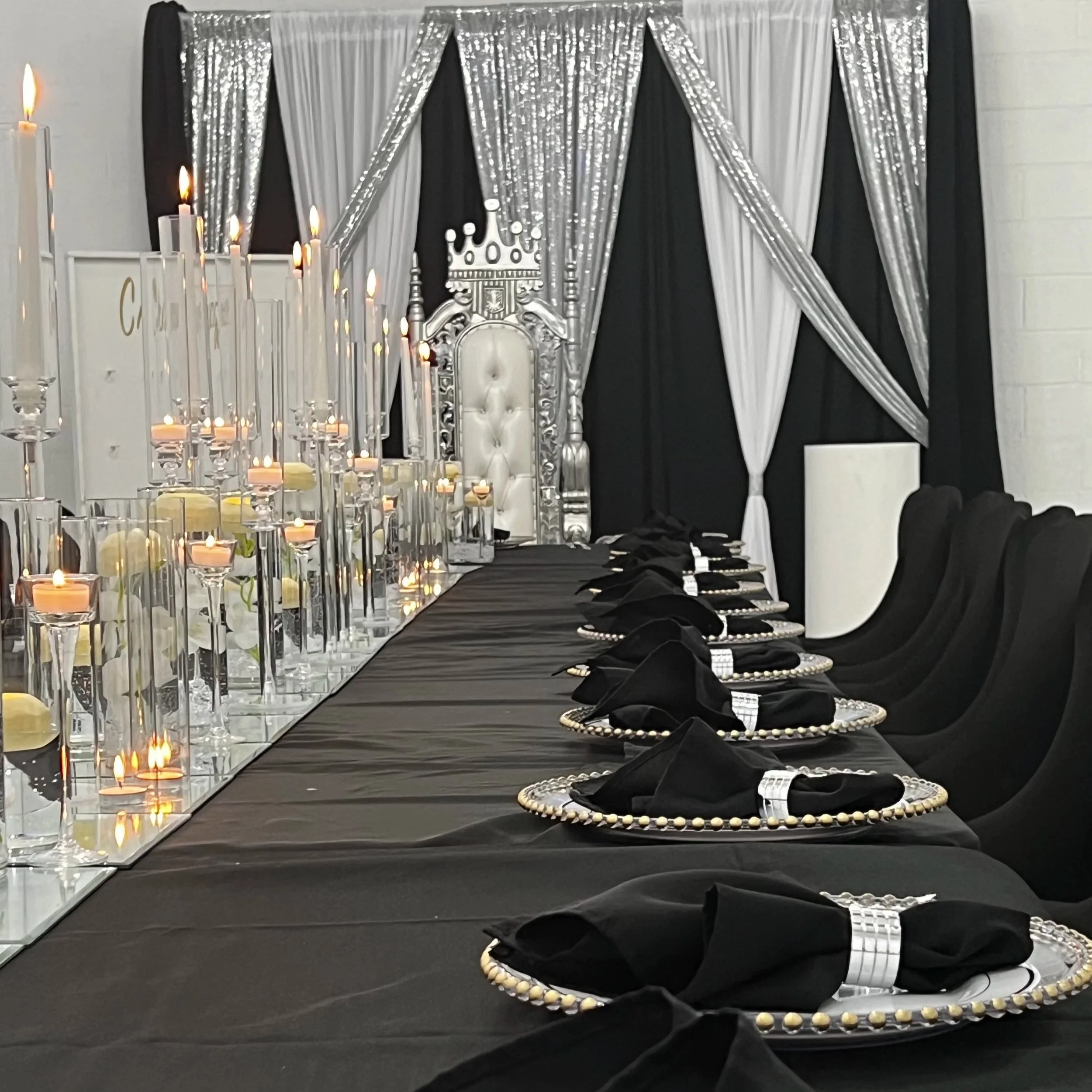 Price is per table. This is to display our table setting designs. Centerpieces can be upgraded. We have various napkins design options.